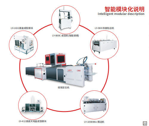 LY-485シリーズ製品。フィーダー、グルーイング、コンベアベルトの部品は独立したサーボドライブを採用。ポジショニング部分はYAMAHAロボットアームとカメラを使用してインナーボックスを視覚的に位置決めし、リジッドボックス、ブックケース、引き出しボックス、不規則な形状のボックスで高精度を実現します。電話ボックス、化粧品ボックス、ジュエリーボックス、時計ボックス、ワインボックス、タバコボックスなど、グルーイングが必要な様々な高品質ギフトボックスに適しています。